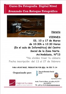 Durante las dos primeras sesiones NO olvides traer cámara fotográfica, ya que aprenderás de forma amena y clara unos conocimientos útiles que te permitirán un doble objetivo; el primero es el de dominar del todo tu cámara, para que de esta forma consigas impactantes fotografías, haciendo un uso correcto de las reglas de composición y las técnicas fotográficas. Y el segundo objetivo que se quiere conseguir a lo largo de la tercera sesión del curso, es el de inculcar enseñanzas para que cojáis habilidades con el proceso nuevo del retoque fotográfico. Esta técnica os ayudará a elaborar otra imagen modificada, ya sea para ganar una mejor calidad o mayor realismo, o para obtener una composición totalmente diferente que distorsione la realidad de esa imagen que se quiere transformar.